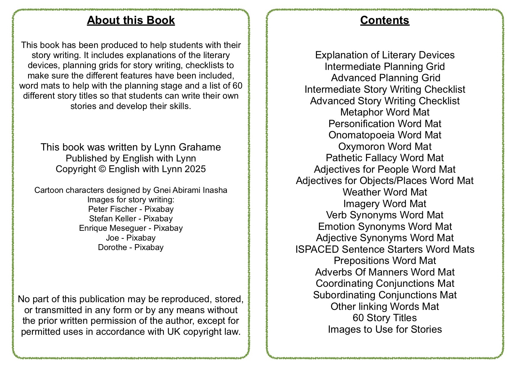 This book has been produced to help key stage 2 students with their story writing. It contains explanations of the literary devices, planning grids for story writing, checklists to make sure the different features have been included, word mats to help with the planning stage and a list of 60 different story titles so that students can write their own stories to develop your skills.